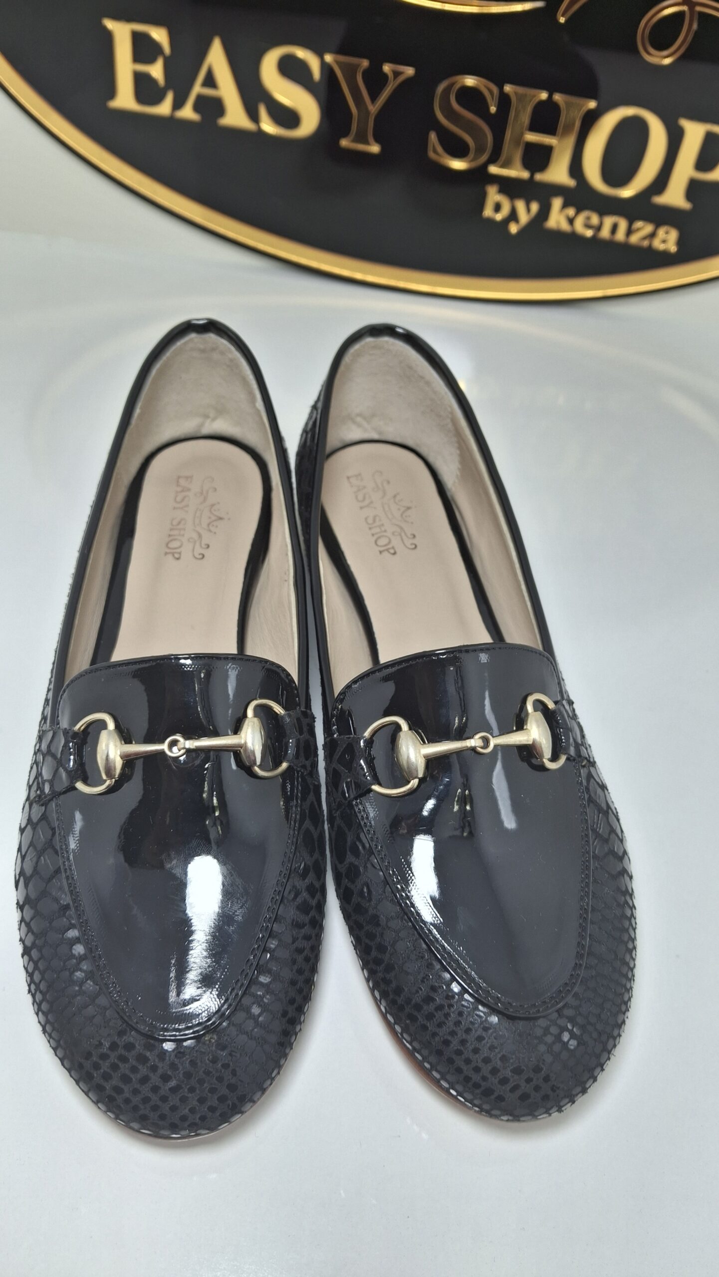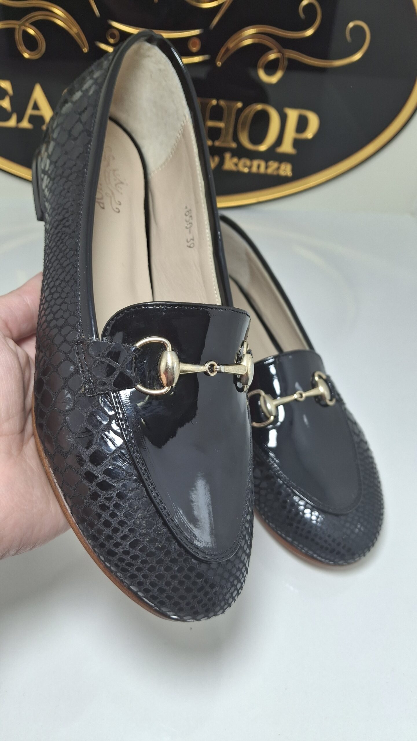 Craquez pour ce mocassin noir en véritable cuir effet serpent, une pièce élégante qui allie caractère et raffinement. Son design est sublimé par un détail en cuir verni ainsi qu’une garniture en métal doré style Massimo, apportant une touche luxueuse et sophistiquée.